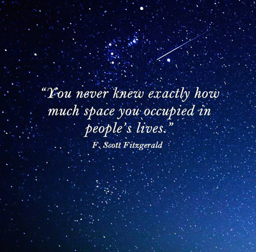 “You never knew exactly how much space you occupied in people’s lives.” — F. Scott Fitzgerald, Tender Is the Night
